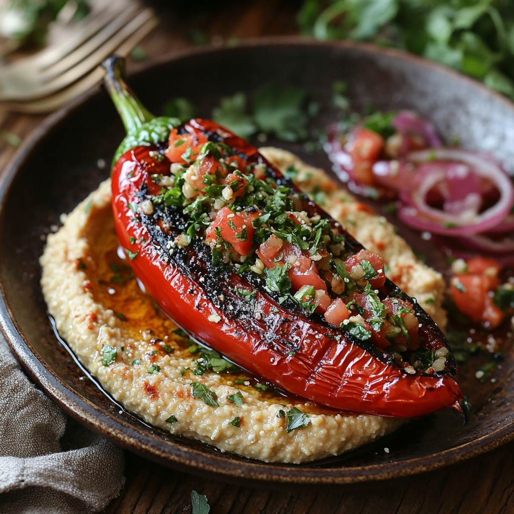 Feurige Fusion: Gegrillte Tabouleh-Paprika mit rauchigem Hummus und verlockenden Sumach-Zwiebeln