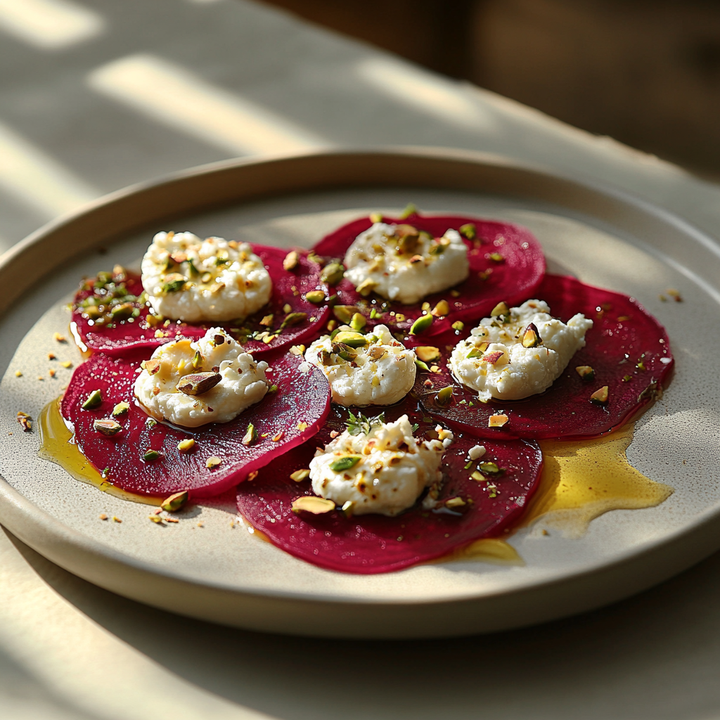 Rote Rüben Carpaccio mit Ziegenfrischkäse und Pistazien