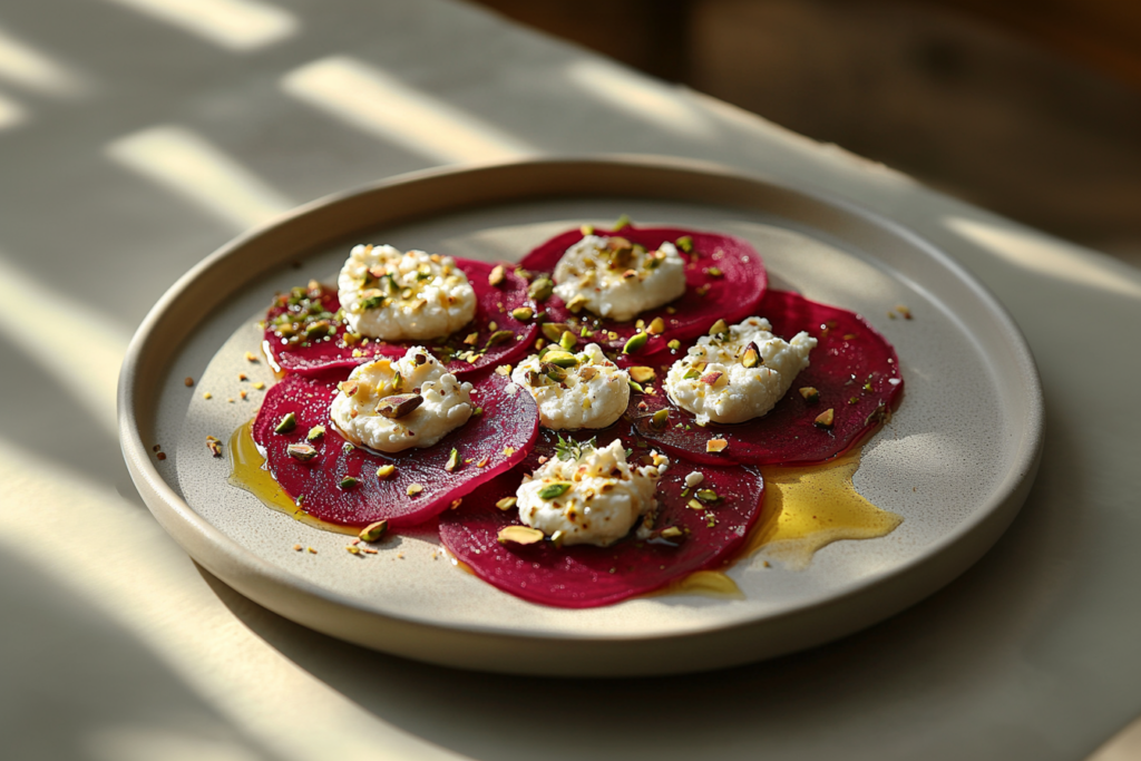 Die leichte Säure der roten Rüben harmoniert perfekt mit der feinen Süße des Ziegenfrischkäses und den nussigen Aromen der Pistazien. Abgerundet wird das Ganze mit einem Schuss hochwertigem Olivenöl, das die Aromen auf dem Teller perfekt miteinander verbindet.